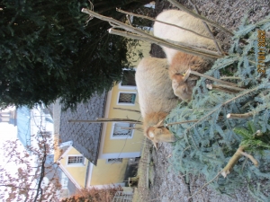 Zäune umbauen und "Möblierung" übersiedeln helfen, Kontrollgänge zu Abdeckplanen, Feuchtigkeit, Motten..?, Restliches Laub von Blumenwiesen einsammeln, Unterstände und Pfade einstreuen bzw. ausmisten, 2-3 h/Tag mit den Määähdels frei beweiden gehen, = Hüten, Wachsamkeit für erwartete Geburten - "Alarm", dann nach Geburten Muttertiere halten für Euterpflege u. -Rasur, beim An- und Abmelken, aktuell auch Lämmer stillen, Generell täglich die Schafe (Damen und Burschen getrennt) füttern (Heu in Raufe, Brot, Wasser,..) / Regelmäßig Essen für 2-Beiner und Brot für 4-Beiner holen (rd.200 m) / Bereits geschorene Wolle vorverarbeiten, reinigen, kartieren, Möglichkeit sich z.B. eigene dreads zu häkeln und zu filzen. u.v.a.m. Nun diverse Frühlings-Vorbereitungen für Obstbäume und den Gemüseanbau beginnen.
