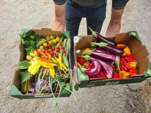 Gemüsevielfalt, Jungpflanzen, Blumensträuße, Schnittblumen, ein Partnerbetrieb am Hof macht Austernpilze wieder andere Honig.